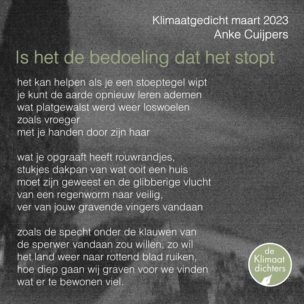 De Klimaatdichters is een beweging van in het Nederlands schrijvende woordkunstenaars. Ze strijden met poëzie voor een klimaatvriendelijke wereld. Heel trots dat mijn gedicht ‘Is het de bedoeling dat het stopt’ werd geselecteerd als klimaatgedicht van de maand maart. Lees meer klimaatpoëzie op:https://www.klimaatdichters.org/
