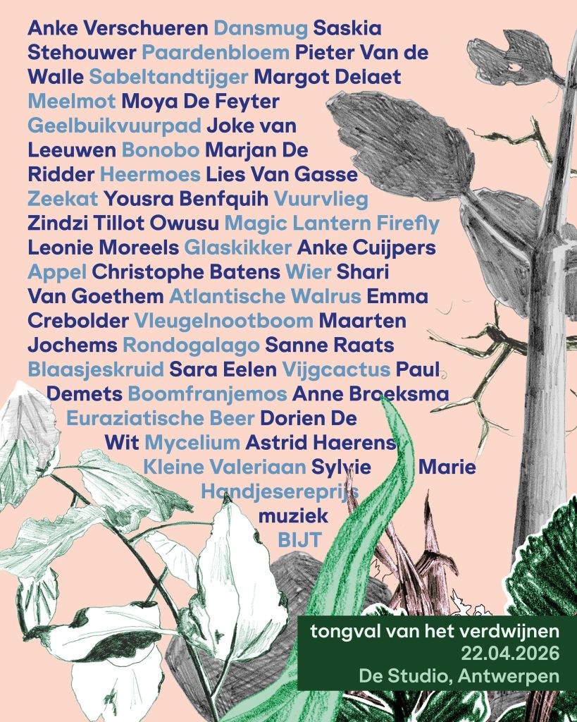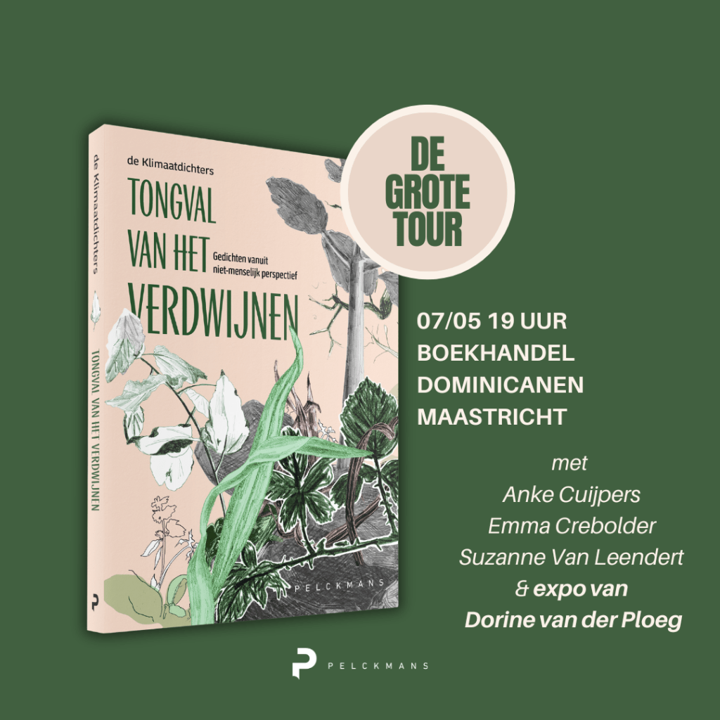 We vormen een meerstemmig koor voor alles wat dreigt te verdwijnen. Op 22 april doe ik mee aan de klimaatdichtersmarathon in Antwerpen. Op 7 mei ben ik een van de dienstdoende dichters in een van de mooiste boekhandels ter wereld, Boekhandel Dominicanen in Maastricht, waar we optreden in een pop-up expositie van Dorine van der Ploeg. Op 21 mei ben ik erbij in de bibliotheek van Tongeren. Grofgebekt, vederlicht of schaduwminnend, het worden levendige evenementen.